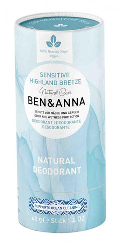 Containing no bicarbonate of soda Ben & Anna deodorants are noticeably gentler and ideal for those with sensitive skin. Highland Breeze is herbal-fresh and gentle at the same time, this sensitive deodorant provides extra freshness each morning with a scent that is clear and pure as mountain air. Properties Ingredients Ingredients: Talc, Cocos Nucifera Oil, Butyrospermum Parkii Butter, Cetyl Alcohol, Stearyl Alcohol, Ricinus Communis Seed Oil, Zea Mays Starch, Helianthus Annuus Seed Cera, Coco-Caprylate/Caprate, Zinc Ricinoleate, Caprylic/Capric Triglyceride, Rhus Succedanea Fruit Cera, Shorea Robusta Resin, Vitis Vinifera Seed Oil, Rhus Verniciflua Peel Cera, Glyceryl Caprylate, Parfum, Citrus Limon Fruit Oil, Limonene, Magnesium Chloride, Tocopherol, Ascorbyl Palmitate, Citronellol, Helianthus Annuus Seed Oil, Simmondsia Chinensis Seed Oil, Linalool, Geraniol, Citral, Daucus Carota Sativa Root Extract, Rosmarinus Officinalis Leaf Extract Dietary Information This product is suitable for the following requirements: Vegetarian Vegan Allergens This product is hypoallergenic / does not contain any of the 14 major allergens listed in Annex II (1169/2011) of the EU Food Information for Consumers Regulation. Format Format Solid Cream Quantity 1 Weight (grammes) 40 Directions & Storage Directions: To apply, push up bottom of the tube with the thumb and then rub a thin layer of deodorant under the arms. Storage: Store in a cool, dry place away from direct sunlight and heat Warnings Do not exceed the recommended daily intake/dose Do not purchase or consume if the seal is broken Keep out of reach of children Food supplements should not be used as a substitute for a varied and balanced diet and healthy lifestyle Storage Certification Certified Vegan Certified Organic
