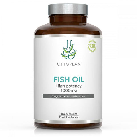 Cytoplan high potency fish oil capsules give you 550mg of the essential fatty acids EPA/DHA per 1000mg. These Fish Oils are guaranteed to be clean, stable & free from pollutants. Fatty acids are recognised as having an essential role in normal brain function. Properties Ingredients Ingredients: Fish oil concentrate (from sardine and anchovy), mixed tocopherols (antioxidant), capsule shell (gelatin and glycerin). Allergy advice: For allergens, see ingredients in bold. There are 14 major allergens listed in Annex II (1169/2011) of the EU Food Information for Consumers Regulation. Additives: Mixed tocopherols. Nutrient Information Nutrient Information: Daily Intake Amount: One capsule % NRV* Fish Oil 1000 mg ✝ EPA 330 mg ✝ DHA 220 mg ✝ Total Omega 3 Content 550 mg ✝ * NRV is the Nutrient Reference Value ✝ NRV not yet established Allergens Contains: Fish Format Format Capsules Quantity 120 Dimensions of Capsule Length 22 mm Width 10 mm Can capsule be opened and sprinkled onto food? No Directions & Storage Directions: One to two capsules daily or take as directed by a practitioner. Storage: Store in a cool, dry place away from direct sunlight and heat Warnings Not suitable for children Do not exceed the recommended daily intake/dose Do not purchase or consume if the seal is broken Keep out of reach of children Food supplements should not be used as a substitute for a varied and balanced diet and healthy lifestyle Additional Warnings: Avoid if there is any deficiency of the liver, or if you are on blood thinning medication consult your doctor first, or take no more than one capsule daily. Storage Images Package Label