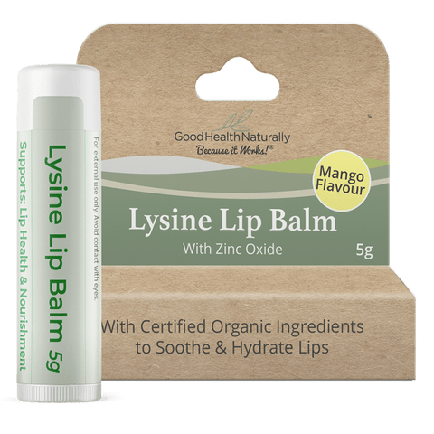 Lysine Lip Balm is a unique formula of organic ingredients to support the health of your lips. It includes the nourishing benefits of coconut oil, olive oil and jojoba oil, with a pleasant mango flavour, to provide protection against dry/chapped lips, cold sores and environmental stressors. Properties Ingredients Ingredients: Coconut OiI, Beeswax*, Castor Oil*, Safflower Oil*, Olive Oil*, Jojoba Oil*, Mango Flavour, Carnauba Wax, Purified Water, Tocopherol (Vitamin E), Lysine HCL, Monolaurin, Zinc Oxide *Certified Organic Dietary Information This product is suitable for the following requirements: Vegetarian Allergens This product is hypoallergenic / does not contain any of the 14 major allergens listed in Annex II (1169/2011) of the EU Food Information for Consumers Regulation. Format Format Balm Weight (grammes) 5 Directions & Storage Directions: The Lysine Lip Balm can be used on a regular basis in the same way you would use your normal lip balm. You can use it frequently throughout the day if required. Warnings Do not exceed the recommended daily intake/dose Do not purchase or consume if the seal is broken Keep out of reach of children Food supplements should not be used as a substitute for a varied and balanced diet and healthy lifestyle Storage Certification Certified Organic