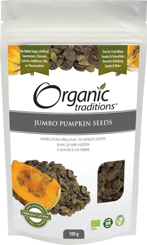Certified Organic Jumbo Pumpkin Seeds. A good source of zinc, iron, magnesium, protein and fibre, plus other nutrients. Eat as a nutritious raw, vegan snack and add to trail mixes, smoothies, salads or favourite recipes. Raw, vegan goodness.