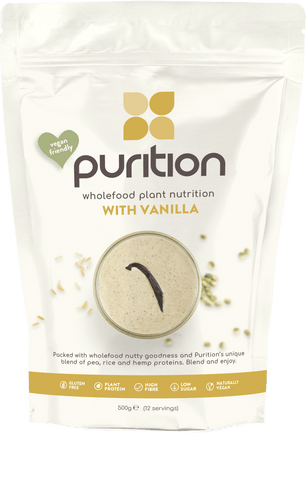 With this dairy-free vegan protein blend and wholefood ingredients, it’s easy to feed your body with all the nutrients, fibre and vitamins you need. Ideal as a healthy breakfast option or healthy protein/meal replacement shake. Properties Ingredients Ingredients: Protein Blend: (European Pea, Pumpkin, Sunflower & Hemp protein), Golden Linseed (Flax), Sunflower Kernels, ALMONDS, Coconut, Chia Seeds (Salvia Hispanica), Pumpkin Seeds, SESAME Seeds, Nutritional Yeast, Psyllium Husk, Apple Pectin, Vanilla Pods (1%), Natural Flavouring, Sweetener- Steviol glycosides (Stevia). Allergy advice: For allergens, see ingredients in bold. There are 14 major allergens listed in Annex II (1169/2011) of the EU Food Information for Consumers Regulation. Sweeteners: Steviol Glycosides (Stevia). Nutrient Information Nutritional Information: Per 100g Energy (kJ) 1699 kJ Energy (kcal) 408 kcal Fat 31 g of which Saturates 7.7 g Carbohydrate 10.7 g of which Sugars 2.3 g Protein 37.3 g Salt 0.2 g Dietary Information This product is suitable for the following requirements: Vegetarian Vegan Allergens Contains: Tree Nuts (e.g. Almonds, hazelnuts, walnuts, cashews, pecans, brazils, pistachios, macadamia nuts, queensland nuts) Sesame seeds Format Format Powder / Granules Weight (grammes) 500 Directions & Storage Directions: A 40g serving of Purition can be enjoyed once and occasionally twice daily. Put 200-250ml of your favourite milk into a blender. Add 40-50g of Purition, and anything else you might like! Blend and enjoy as a healthy shake. Or simply stir in to natural or greek yogurt. Storage: Store in a cool, dry place away from direct sunlight and heat Warnings Contains sweetener(s) Do not exceed the recommended daily intake/dose Do not purchase or consume if the seal is broken Keep out of reach of children Food supplements should not be used as a substitute for a varied and balanced diet and healthy lifestyle Additional Warnings: Made in a factory that handles nuts. Storage Certification Certified Gluten Free Certified Vegetarian Certified Vegan
