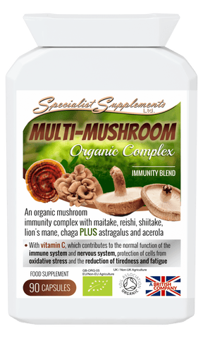 A 100% organic mushroom immunity blend with maitake, reishi, shiitake, lion's mane, chaga PLUS astragalus root, acerola fruit and black pepper - all in one convenient capsule, providing important nutrients (such as vitamin C). Backed by science with EFSA approved health claims. Properties Ingredients Ingredients: Organic Shiitake Mushroom Powder (Lentinula edodes), Capsule Shell: Hydroxypropyl Methylcellulose (HPMC), Organic Chaga Mushroom Powder (Inonotus obliquus), Organic Maitake Mushroom Powder (Grifola frondosa), Organic Acerola Fruit Powder (Malphigia glabra) (17% Vitamin C), Organic Reishi Mushroom Powder (Ganoderma lucidum), Organic Astragalus Root Powder (Astragalus membranaceus), Organic Lion's Mane Mushroom Powder (Hericium erinaceus), Organic Black Pepper Powder (Piper nigrum) Nutrient Information Nutrient Information: Daily Intake Amount: One capsule % NRV* Vitamin C (from Organic Acerola Fruit (Malphigia glabra)) 12 mg 15 * NRV is the Nutrient Reference Value ✝ NRV not yet established Dietary Information This product is suitable for the following requirements: Vegetarian Vegan Allergens This product is hypoallergenic / does not contain any of the 14 major allergens listed in Annex II (1169/2011) of the EU Food Information for Consumers Regulation. Format Format Capsules Quantity 90 Can capsule be opened and sprinkled onto food? Yes Directions & Storage Directions: Take one capsule, one to three times per day or as required. Storage: Store in a cool, dry place away from direct sunlight and heat Warnings If you are pregnant, breast-feeding, have a medical condition or are under medical supervision, please consult a doctor before use Do not exceed the recommended daily intake/dose Do not purchase or consume if the seal is broken Keep out of reach of children Food supplements should not be used as a substitute for a varied and balanced diet and healthy lifestyle Storage Images Package Label Certification Certified Organic Certified GMP Accredited ISO 9001