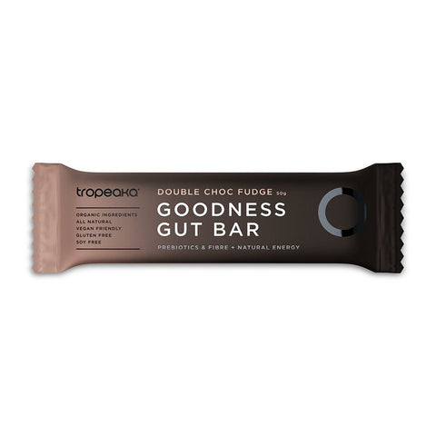 Don't have the time to feed your gut what it needs? Well, Tropeaka's Goodness Gut Bar combines a delicious and highly-effective blend of prebiotics that help feed beneficial bacteria! It's a bar that not only tastes great but plays a part in restoring a happy, healthy gut! Properties Ingredients Ingredients: Dates*, Dark Chocolate Chips* (Cacao Mass*, Cane Sugar*, Cacao Butter*), Prebiotic Blend (9.8%) (Green Banana Resistant Starch Powder*, Acacia Gum, Inulin*), Maple Syrup*, Coconut Milk Powder*, Dutch Cocoa* (9.4%), 100% Peanut Butter, Cacao Butter*, Coconut Oil*, Peanuts*, Almonds*, Natural Caramel Flavour, Vanilla Extract*, MCT Oil*, Himalayan Salt*, Acerola* *Certified Organic. May be present: Sesame, cashew, other tree nuts. May contain occasional nut, shell or pit pieces. Allergy advice: For allergens, see ingredients in bold. There are 14 major allergens listed in Annex II (1169/2011) of the EU Food Information for Consumers Regulation. Sweeteners: Cane Sugar. Nutrient Information Nutritional Information: Per 100g Energy (kJ) 1448 kJ Energy (kcal) 0 kcal Fat 2.4 g of which Saturates 6.1 g Carbohydrate 39.8 g of which Sugars 28 g Protein 11.7 g Salt 0 g Dietary Information This product is suitable for the following requirements: Vegetarian Vegan Allergens Contains: Peanuts Tree Nuts (e.g. Almonds, hazelnuts, walnuts, cashews, pecans, brazils, pistachios, macadamia nuts, queensland nuts) Sesame seeds Format Format Bars Quantity 1 Weight (grammes) 50 Directions & Storage Directions: Enjoy at any time of day! Whether it's an on-the-go breakfast snack or an afternoon pick-me-up, your gut and body will be loving the Goodness Gut Bar! Storage: Store in a cool, dry place away from direct sunlight and heat Warnings Contains sugar Do not exceed the recommended daily intake/dose Do not purchase or consume if the seal is broken Keep out of reach of children Food supplements should not be used as a substitute for a varied and balanced diet and healthy lifestyle Storage